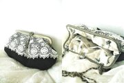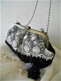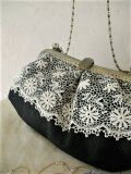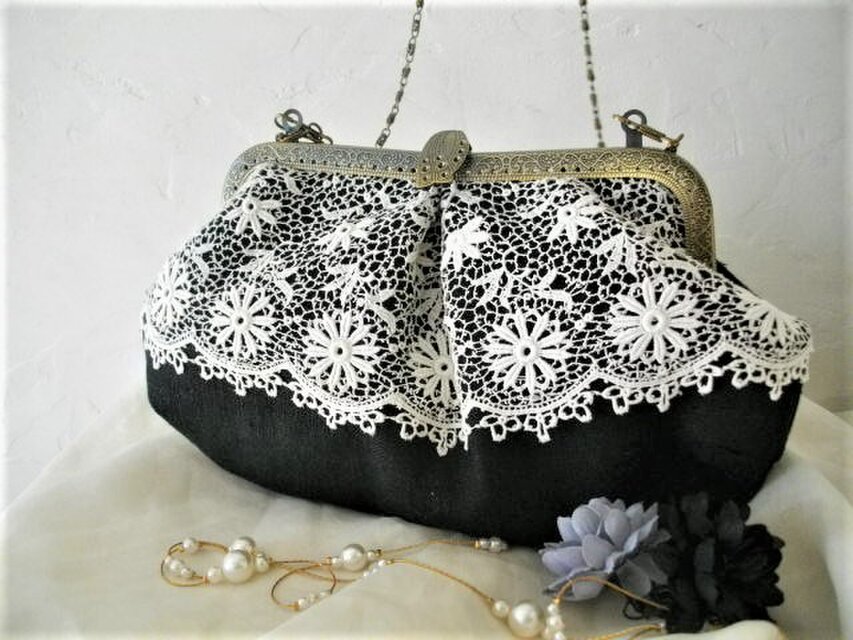黒リネンにアンティークギュピールレースをのせたがま口バッグ