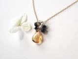 淡い蜂蜜色のシトリンに、ブルーゴールドストーンやブルーサンドという深い紺に金粒を散らした人工石やレモンクォーツ、淡水パールをあわせた愛らしい形ですがシックなネックレス。