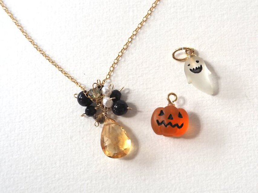 選べるハロウィンパーツがついたネックレスです。勿論パーツを外すと、大粒シトリンのネックレスとして普段にお使い頂けます。