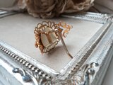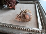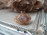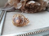 金糸のレースや繊細なデザインの透かしパーツを重ね、中央にアクリル製のカボションを置きました。