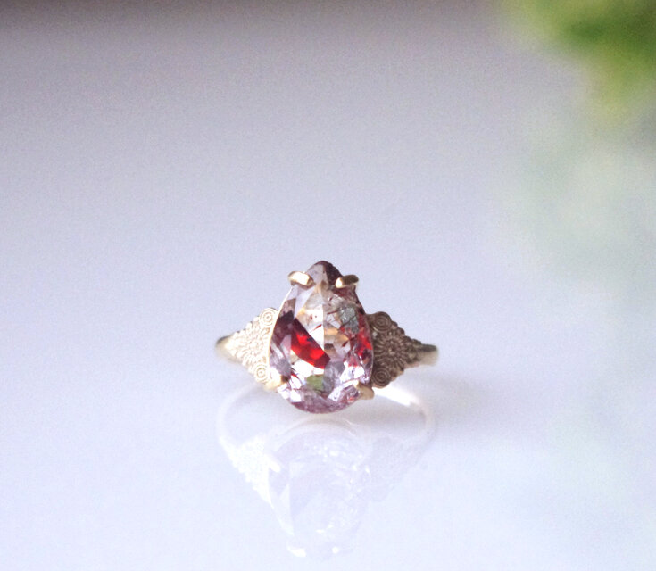 しっかりしたサイズとファセットカット、透明感と内包物のキラキラ感などのいろいろな要素があいまって存在感抜群のひとつぶ。