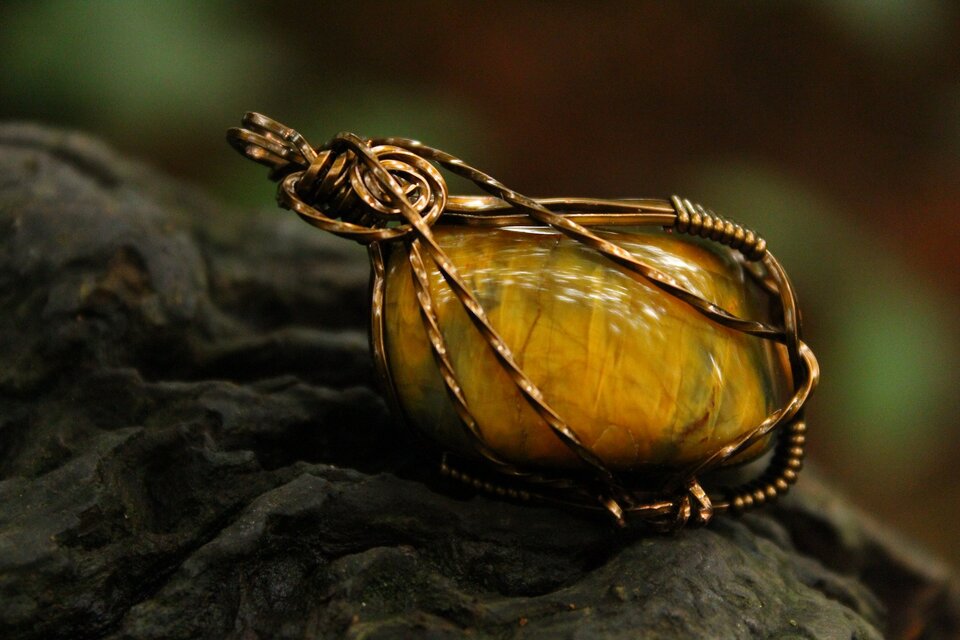 光沢のある美しい色合いのネライトのタンブルを、アンティークゴールドのワイヤーで巻きました。