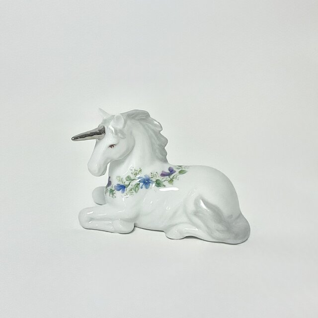 形が美しい白磁のユニコーンは、プラチナの角を持ち、スミレのリースをかけています。