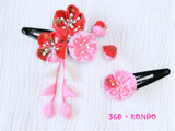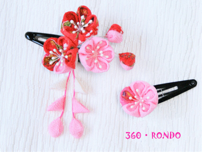 ちりめんつまみ細工の髪飾りは、七五三のお着物によく似合う赤色と桃色です。