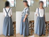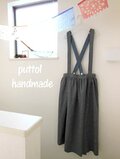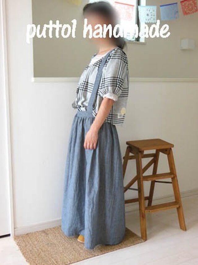 コットンリネンのふんわりダンガリーで作ったサスペンダーつきのギャザースカートです。