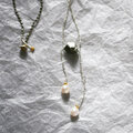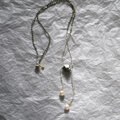 2種類のレインボームーンストーンの美しさ、間に挟み込まれた金色のヴェルメイユ、キラキラと繊細に輝くシルバーの蝋引き糸、そこに編み込まれた小さなパール、どれもとても素敵です。 軽くて着け心地が良いし、長さ調節もできるし、留め具が外れて落とす心配もない。季節を問わず愛用してしまいそうです。 素敵な作品をありがとうございます!