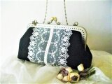 黒リネンにアンティークチュールレースをのせたがま口バッグ