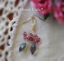 光をかざすと青白いラブラドエッセンスといわれるシラーが現れ、約9から10㎜程のラブラドライトマーキス化とに綺麗なピンククォーツを添えてピアスを創りました。。