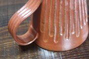 白土で成形し、シノギ模様を削り出してあります。内側は白色マット調でツヤはなく落ち着いた印象で、飲み物も映えます。外側のシノギ部分は鉄赤釉を施してあります。