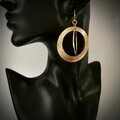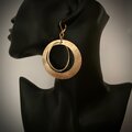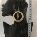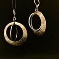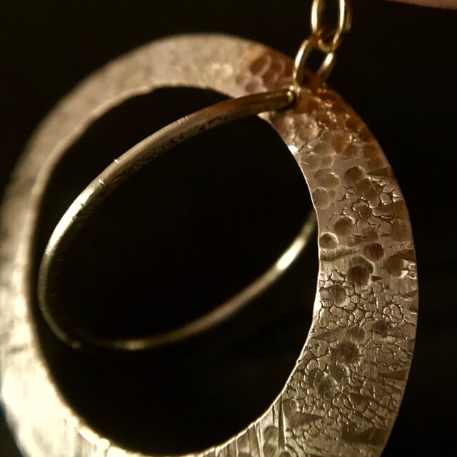 真鍮の宇宙をイメージした大振りなピアス。1mm厚の真鍮を丸く切り抜いて、テクスチャーハンマーで槌目と立体感を出し、その中に、ゆらゆら揺れるように輪の中にリングを付けました。槌目が少しづつ違います。