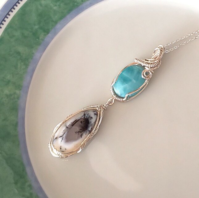 世界3大ヒーリングストーンの1つラリマーとデンドライトオパールを繋いでペンダントを作りました。