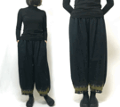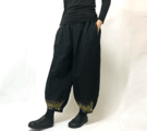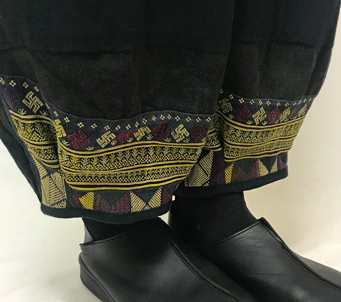 人気のもんぺパンツに美しいヤオ族の刺繍をあしらった新作です。黒無地のタイ手織り綿に渋い手刺繍が映えてとても可愛いです。