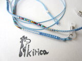 わずか1mmのちいさいビーズをブルーの紐に編みつけて