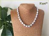 比較的照り艶が良い(一部スレが見られる粒が含まれます)、ややブルーがかったメタリックシルバーの大粒バロックパールをあしらい、グレーのナイロンコードでそれぞれをひと粒ごとに結び留めオールノット仕立てのショートネックレスに仕上げました。パールの粒が大きめですのでショートサイズでも存在感があります。