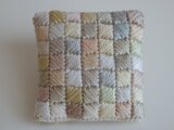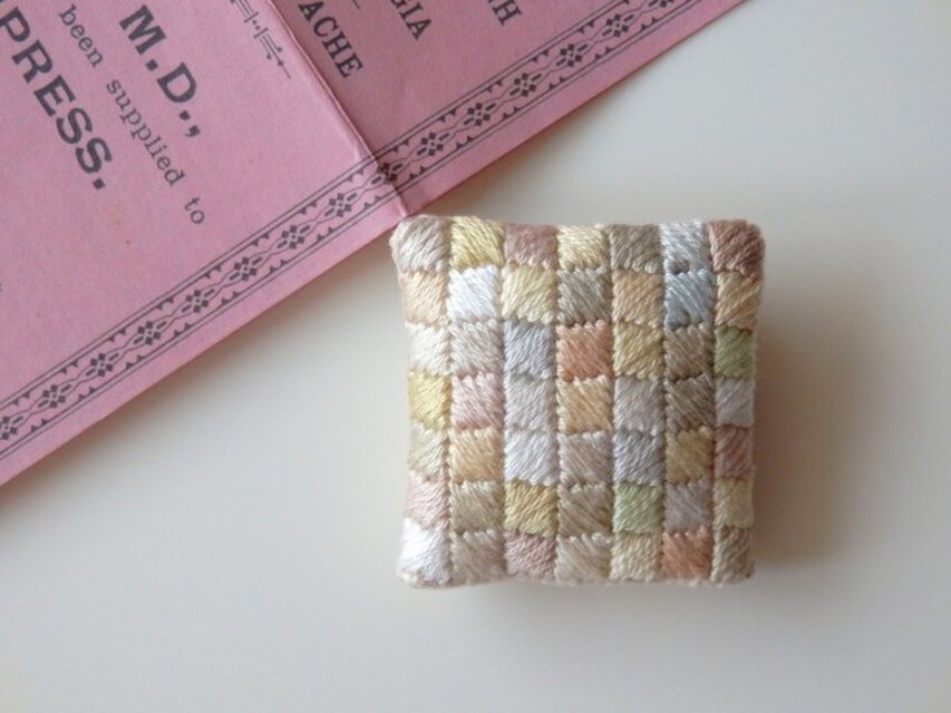 隣り合う色や刺す方向を少しずつ変えていますので、動くと色味が違って見えます。裏地にはリバティ布を使用しています。また、少しわたをつめていますのでふっくらとしています。