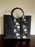 黒地に華やかな松竹梅柄の帯地を細い縞の紬とはぎ合わせて、丸い木の手の手提げに仕立てました。