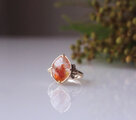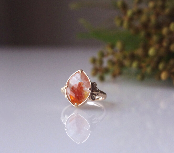 鮮やかなレッドとイエローのインクルージョンが揺らめく炎のように入っていて、石のシェイプとのバランスがとても良いです。