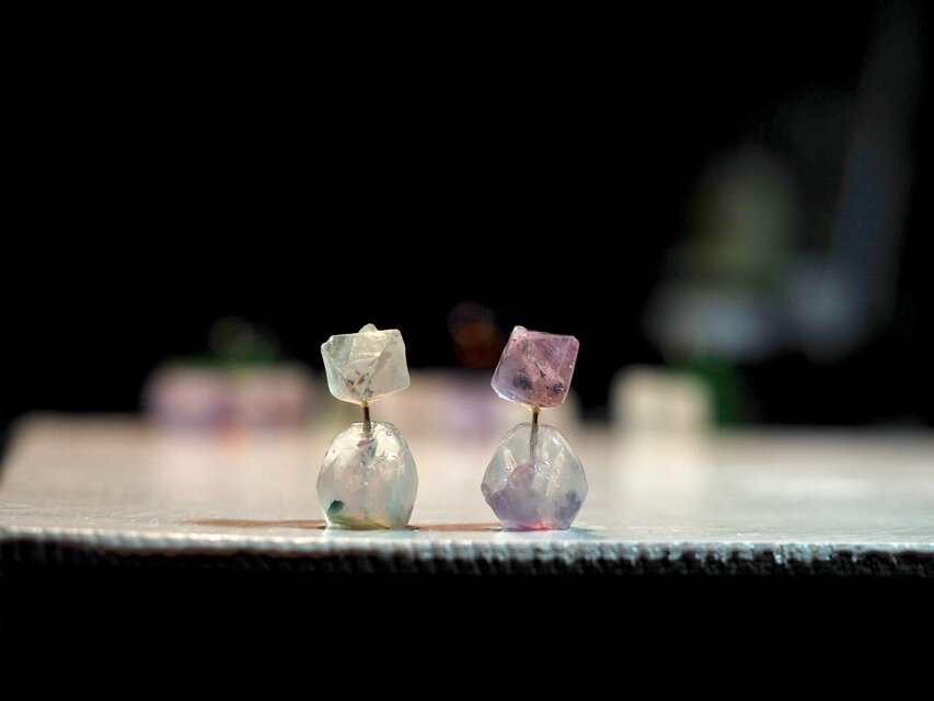 フローライトに似せて作った樹脂製のオリジナルピアスキャッチが個性的なピアスです