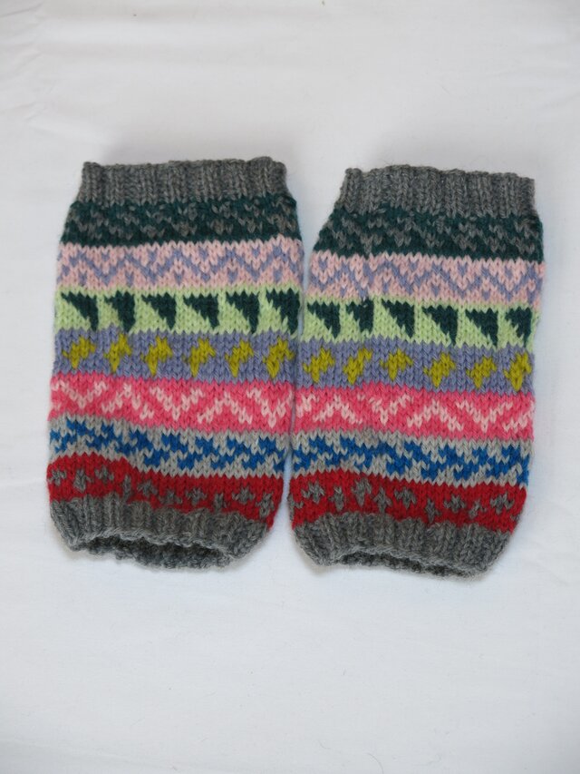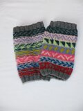 100色の毛糸から選んで一針一針編んだ、カラフルなフェアアイルのレッグウォーマーです。