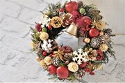 リース素材:アーティフィシャルフラワ-(造花):りんご2種類・小さな赤い実・コニファー・グリーン、など。 自然素材:松かさ・ワタカラ・カラマツ・スターアニス・アンバーバーム、など。その他:オーナメント(メタル製のベル ・ホワイトペイントされた木製の雪の結晶 どちらも取り外しができます)、など。