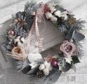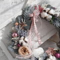 スモーキーな色合いのプリザーブド加工されたピンク色のバラとふわふわした白いコットンボールを入れ、大人可愛いリースを作ってみました。グレーリーフのユーカリとコニファーを土台にしたリースにホワイトとグレイッシュピンクのオーナメントや木の実、ヒイラギを散りばめています。