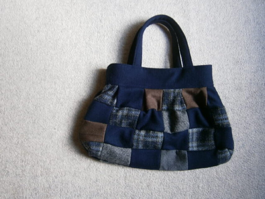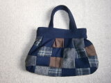 濃紺のウール生地をベースに、いろいろな生地を使って、ふんわり優しい感じのバッグを作ってみました。