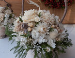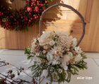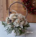 使用花材 ソラフラワー、ヤマハハコ、貝細工、プリザーブド/アジサイ、スターフラワー、かすみ草、ユーカリフルーツ、ペパーベリーなど。