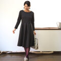 ・寒い季節に着たくなる、ウール混の厚みのある生地を選びました。表面に艶はなく、マットな質感。チャコールグレーとブラウンの中間のような落ち着いた色で、秋冬の日常着としておすすめです。マフラーやタイツ、帽子など小物類も合わせやすいです。