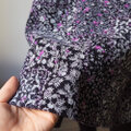 ・上品なパープル小花の総柄です。表面をよく見ると細かいパイル地になっています。適度にハリがあってフォーマルな印象もあり。黒や紺はもちろん、白やベージュなど明るい色と合わせて、大人フェミニンなコーディネートを楽しめる一枚です。