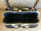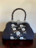 焦げ茶の細い縞の紬と、黒地に松竹梅柄の帯地を剥いで、竹の手のがま口手提げを作りました。全体が帯地柄の手提げも華やかでかわいらしいのですが、こちらの手提げも、落ち着いた感じと華やかさが同居している素敵な手提げになったと思います。