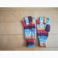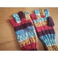 赤、黄色、水色、茶色と秋らしい素朴な段染め糸で編んだ手袋です。薄手で指先がほんの少しでるので作業しやすいです。サイズ レディースS~M