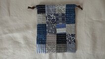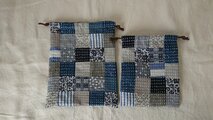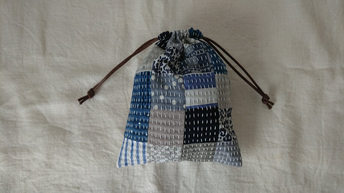 ブルーやグレー系の布をパッチワークして巾着を作りました。