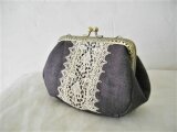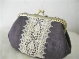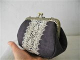 シックな色味のパープルリネンにアンティークレースをのせたがま口ポーチ