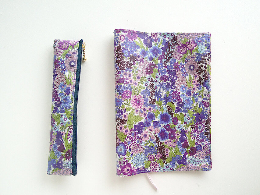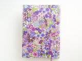 リバティの人気生地、マーガレットアニー Margaret Annie(パープル)のラミネート生地(つや無)でA5サイズのノートカバー・バンド付きペンポーチを作りました。