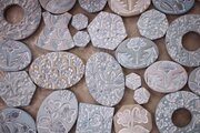 陶土にオリジナルの草花の消しゴムはんこを捺したブローチです。