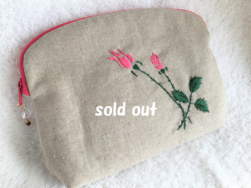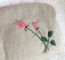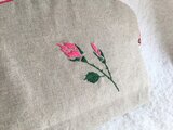 ナチュラルベージュの綿麻布地にローズピンクのバラを刺繍しました。