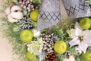 たくさんの青リンゴとポインセチアや松ぼっくり、コットンが共演