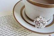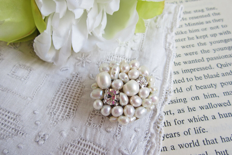 大きさや、形が様々な純白の淡水真珠や、スワロフスキーなどを使用した小さいけれど存在感のあるブローチです。