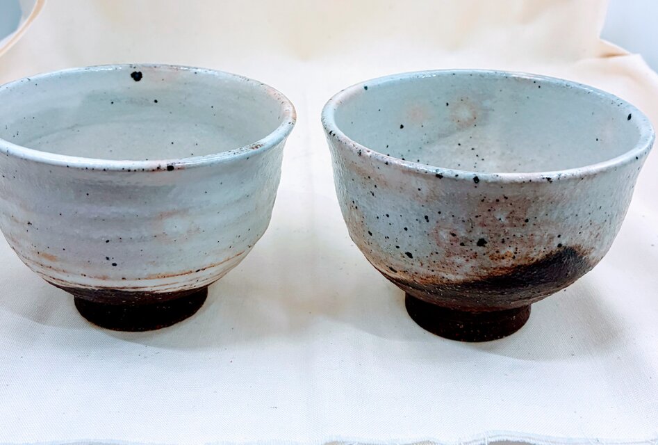 常滑おぼろ土に白化粧してマット釉薬と透明釉薬をかけています。。焼きの表情で、微妙な表情が出ます。赤い御本手や土の中の鉄分も出て表情になります。