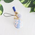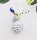 北欧風サークルフラワー柄スモークブルー色、綿オックス地のマカロンポーチストラップです。