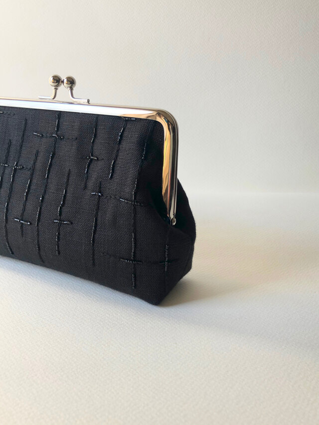 黒いリネン生地に刺繍糸とビーズで十字架のような刺繍をしました