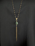 スピネルはエメラルドとチェーンを結ぶように配置され、一方は真鍮チェーンによるフリンジにつながり、もう一方は真鍮デザインチェーンにつながります。
