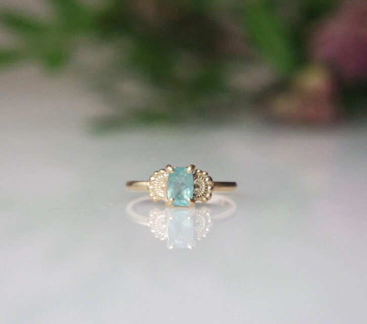 小ぶりなピースで両側にaicaのオリエンタルな花モチーフをあしらったデザインなので、フェミニンな印象のリングに仕立てあがったと思います。