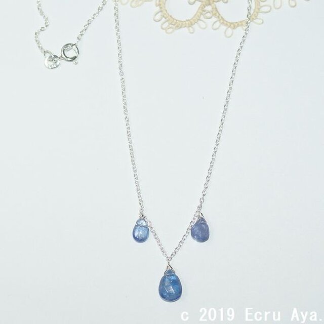 中央に一連で一番大きな物を下げ、その左右に小さなタンザナイトを下げています。