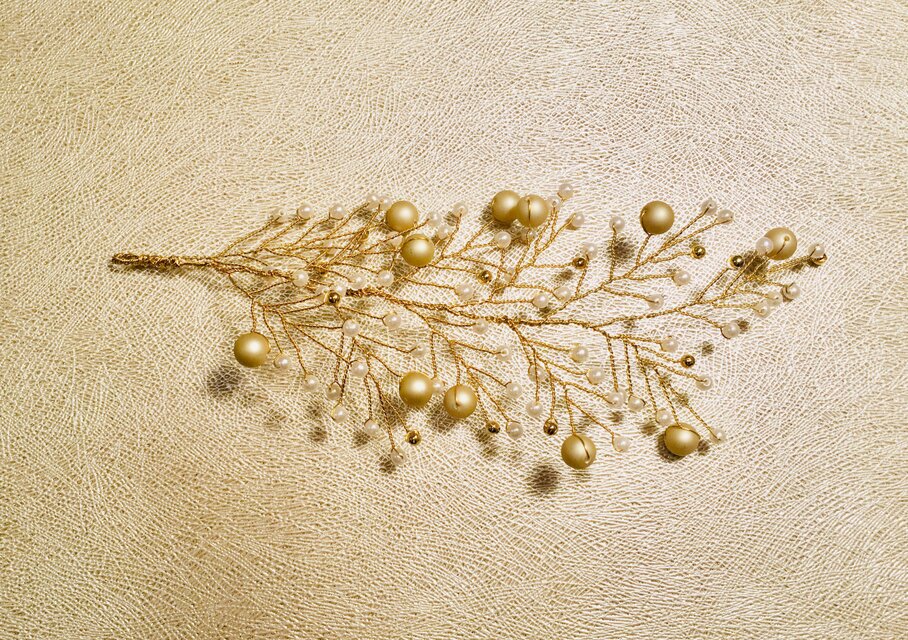 たっぷりのパールビーズをゴールドのワイヤーで編みつけていったヘッドドレスです!