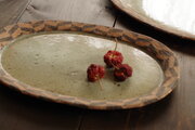 黄味を帯びた淡い緑色のお皿は、素朴で落ち着いた風合いで、どんなお料理にも合いそうです。 おかずを盛ったり、パンやおやつをのせたりと、お料理をするのが楽しみになる一皿です。 長く愛用していきたいと思います。