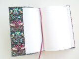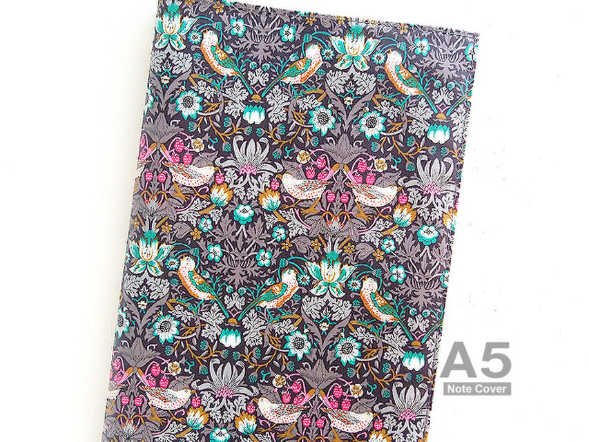 リバティの人気生地、Strawbery Thief ストロベリーシーフ(ダークブラウン)のラミネート生地(つや無)でA5サイズのノートカバーを作りました。