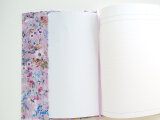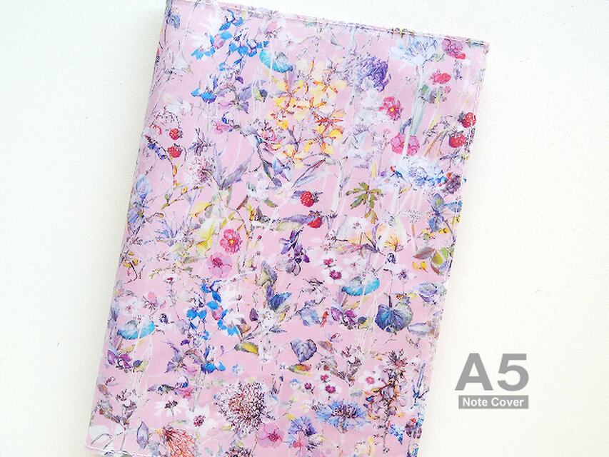 リバティの人気生地、ワイルドフラワーズ Wild Flowers(ピンク)のラミネート生地(つや無)でA5サイズのノートカバーを作りました。