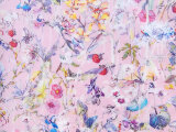 『英国の花図鑑』のイラストから着想を得てデザインされた柄です。繊細なタッチの植物画がデジタルプリントで写実的に表現されています。生地の地の色がピンク、花の色がイエロー、オフホワイト、ブルー、レッドなどです。