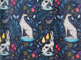 生地の地の色がダークネイビー、動物の犬、ウサギは白と黒のモノトーン。果物のイチゴ、ナシは赤と黄色。葉の色は鮮やかなスカイブルー。